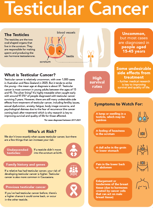Testicular cancer is an uncommon cancer, but it’s the most common cancer in young men aged 15 to 45, with the average age at diagnosis around 37. The good news is that for most people, it’s highly treatable when caught early, thanks to live saving research like that conducted by the Australian and New Zealand Urogenital and Prostate (ANZUP) Cancer Trials Group. Unfortunately, around 40 Australians every year will die from more aggressive and harder-to-treat forms of the disease. Many more will live with undesirable side effects from treatment, which include fertility issues, sexual dysfunction, anxiety, fatigue and body image concerns. This is why awareness and research are so vital.